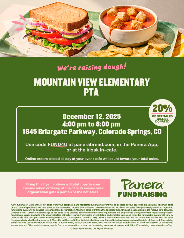Restaurant Nights help to support the Mountain View Elementary PTA. All you have to do is check the schedule below and eat at the restaurant on a specific date. The restaurants each give a percentage of their profits from that day back to our school. Mountain View Elementary holds these events approximately once a month on a weeknight. Check this frequently, because our team is always adding new events.